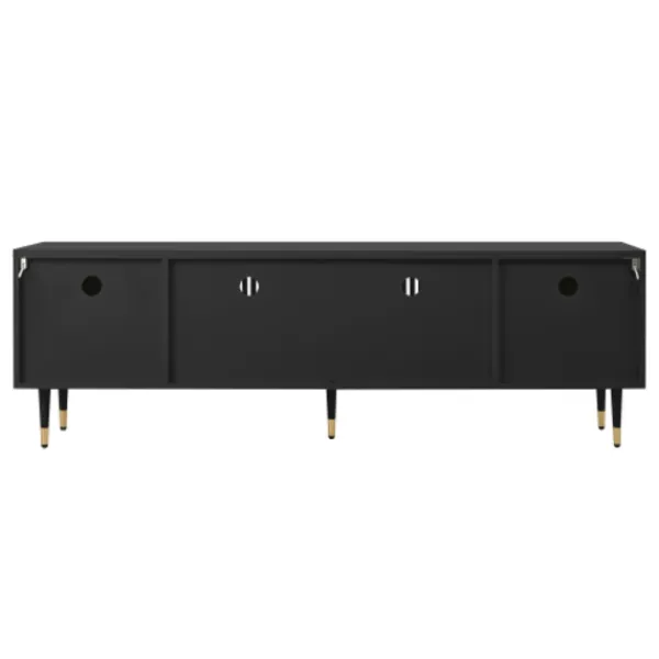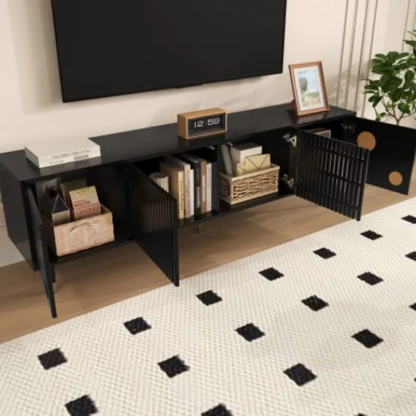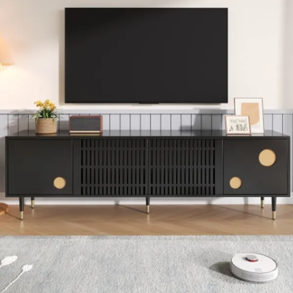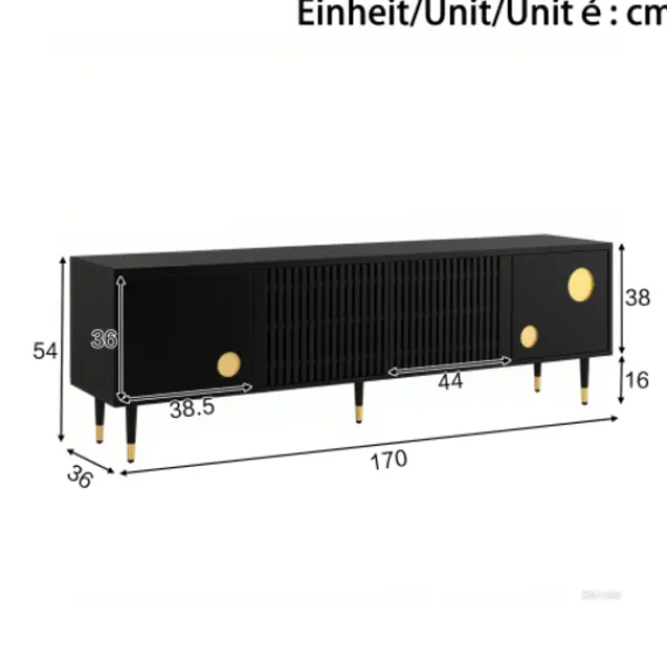 Utsökt design möter funktionalitet: Denna TV-bänk har fyra dörrar, två med moderna ribbor och två med gyllene accenter. Dess eleganta och stilfulla utseende kombinerar perfekt modern och klassisk stil.