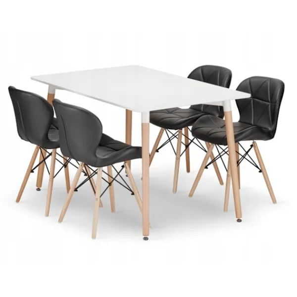 YURO rektangulära bordsset innehåller ett elegant vitt bord och fyra svarta WAKO-stolar, perfekta för att förhöja ditt vardagsrum, kök eller matplats. Denna moderna möbelgrupp kombinerar tidlös design med utmärkt ergonomi, vilket säkerställer både funktionalitet och hållbarhet för vardagligt bruk.