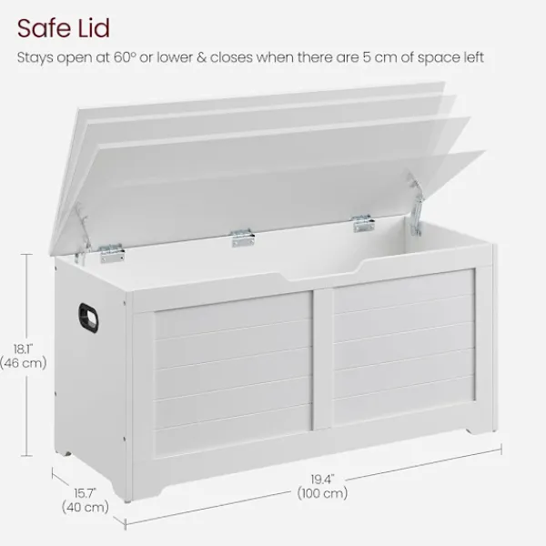 Bänken fungerar utmärkt som skobänk i hallen, som extra avlastningsyta i vardagsrummet eller som förvaring i sovrummet. Den robusta konstruktionen i spånskiva klarar upp till 100 kg, så du kan sitta bekvämt på den när du knyter skorna. Två gångjärn håller locket på plats och minskar risken att klämma fingrarna. Integrerade handtag gör den lätt att flytta.