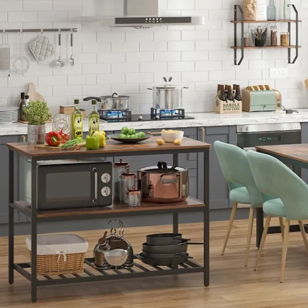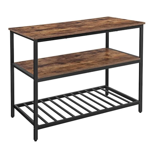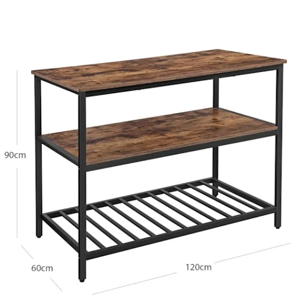 Rymlig köksö med stabil stålram och öppna hyllor i rustik industristil