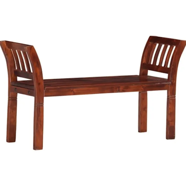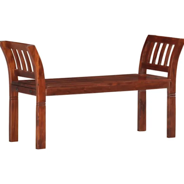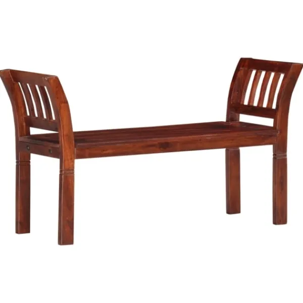 Denna högkvalitativa träbänk blir ett blickfång i hallen, köket eller matrummet. Denna bänk är tillverkad i massivt akaciaträ med valnötsfinish och är väldigt stadig och hållbar. Varje steg i processen utförs med största omsorg, vare sig det är polering, målning eller lackering. De svängda armstöden ger bänken ett elegant utseende. Hallbänken är enkel att montera. OBS: Färgerna och ådringarna varierar från möbel till möbel, vilket gör varje bord unikt. Leveransen är slumpartad.