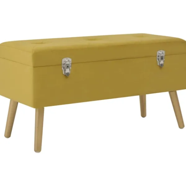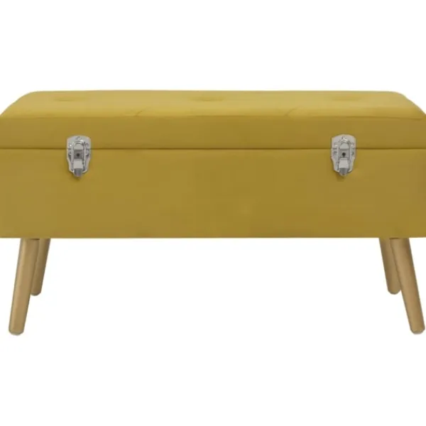 Den gula sammetsklädseln är mjuk och mycket mysig samtidigt som den ger din inredning en färgglad detalj. Den har ett inbyggt förvaringsutrymme med extra plats för att förvara dina prylar. De guldfärgade träbenen bidrar dessutom till hallbänkens stabilitet och hållbarhet. Bänken blir en elegant dekoration i din inredning och en oumbärlig del av rummet.