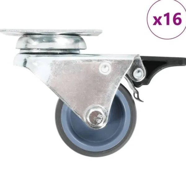 Den här uppsättningen om 16 dubbelhjul, varav hälften har bromsar blir ett bra tillbehör för mindre utrustning och möbler såsom arbetsbänkar, vagnar, soffbord, växtställ, bokhyllor, kundvagnar med mera. Hjulen är tillverkade i TPR (termoplastiskt gummi) som kännetecknas av sitt goda stötdämpande vibrationsmotstånd, som gör dem smidiga och tysta. Dessutom skyddar hjulens mjuka yta ditt golv från repor. Ramen i zinkbelagt järn är högst rostbeständig och bidrar därmed till hjulens stadighet. Hjulen är utrustade med bromsar för flexibel kontroll. Varje hjul har en maximal lastkapacitet på 100 kg.
