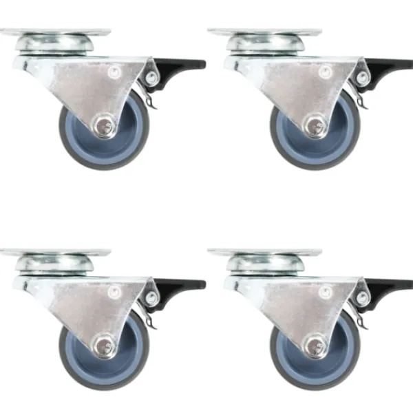 Hjulen är tillverkade i TPR (termoplastiskt gummi) som kännetecknas av sitt goda stötdämpande vibrationsmotstånd, som gör dem smidiga och tysta. Dessutom skyddar hjulens mjuka yta ditt golv från repor. Ramen i zinkbelagt järn är högst rostbeständig och bidrar därmed till hjulens stadighet. Hjulen är utrustade med bromsar för flexibel kontroll. Varje hjul har en maximal lastkapacitet på 100 kg.