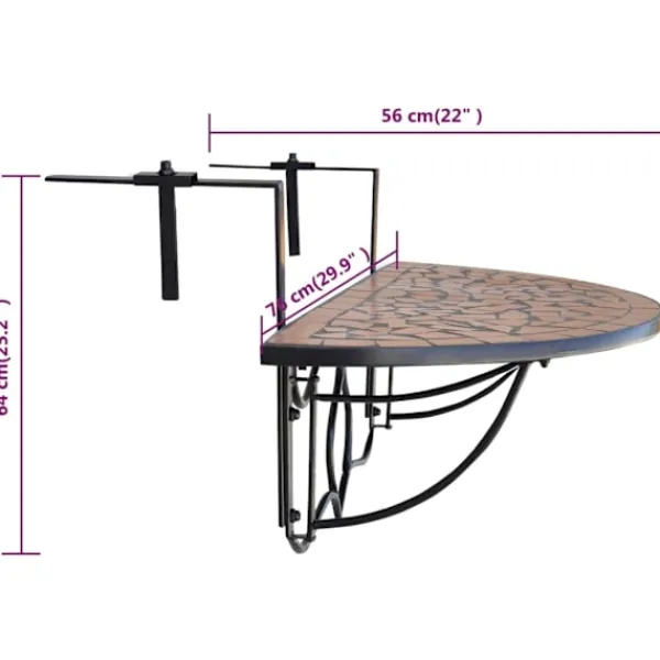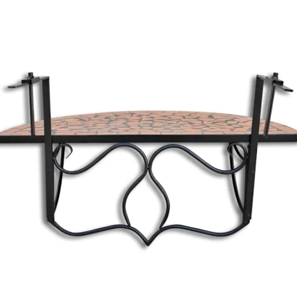 Detta är ett smidigt hängbord som är både snyggt och praktiskt med sin halvcirkel formade konstruktion. Den kommer att bli ett snyggt komplement till er balkong, samtidigt som det erbjuder möjligheten att ta en mysig fika på balkongen. Bordet har en stark och pålitlig järnram med en bordsskiva i keramik som är väderbeständig, samt lätt att rengöra. Detta balkongbord är lämpligt att hänga upp på en list upp till 18 cm bred. Det är både enkelt och smidigt att montera eller demontera när det inte används.
