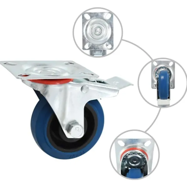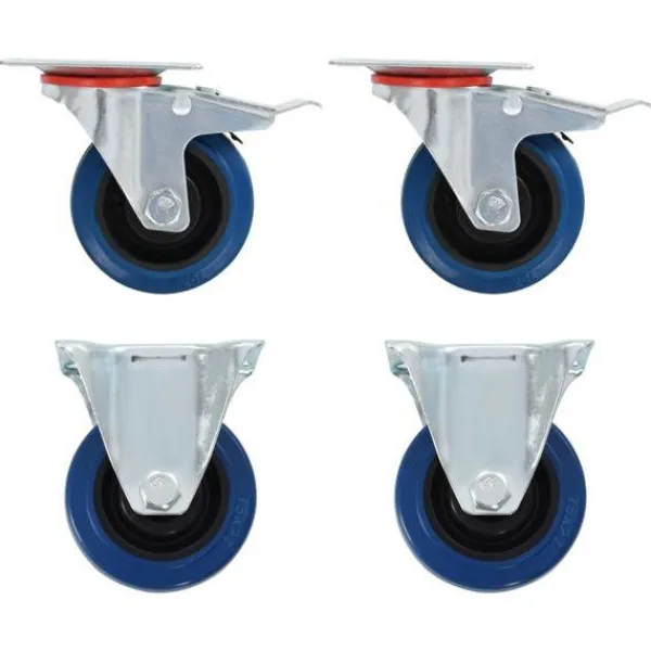 Den här uppsättningen om 12 hjul blir ett bra tillbehör för mindre utrustning och möbler såsom arbetsbänkar, vagnar, soffbord, växtställ, bokhyllor, kundvagnar med mera. Länkhjulen är tillverkade i gummi som kännetecknas av sitt goda stötdämpande vibrationsmotstånd, som gör dem smidiga och tysta. Dessutom skyddar hjulens mjuka yta ditt golv från repor. Ramen i zinkbelagt järn är högst rostbeständig och bidrar därmed till hjulens stadighet. Hälften av dessa hjul är utrustade med bromsar för flexibel kontroll. Varje länkhjul har en maximal lastkapacitet på 60 kg. Vid leverans ingår 6 fasta hjul och 6 länkhjul med bromsar.