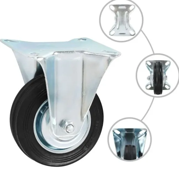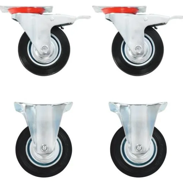 Den här uppsättningen om 4 hjul blir ett bra tillbehör för mindre utrustning och möbler såsom arbetsbänkar, vagnar, soffbord, växtställ, bokhyllor, kundvagnar med mera. Hjulen är tillverkade i gummi som kännetecknas av sitt goda stötdämpande vibrationsmotstånd, som gör dem smidiga och tysta. Dessutom skyddar hjulens mjuka yta ditt golv från repor. Ramen i zinkbelagt järn är högst rostbeständig och bidrar därmed till hjulens stadighet. Två av dessa hjul är utrustade med dubbla bromsar för flexibel kontroll. Varje länkhjul har en maximal lastkapacitet på 70 kg. Vid leverans ingår 2 fasta hjul och 2 länkhjul med dubbla bromsar.