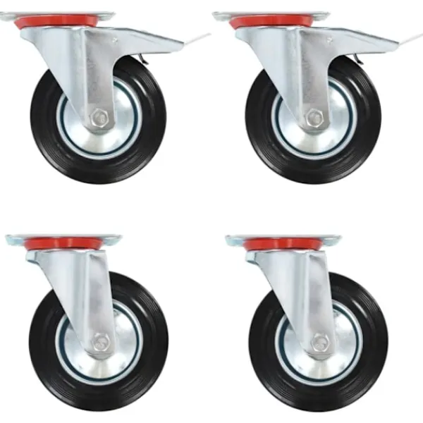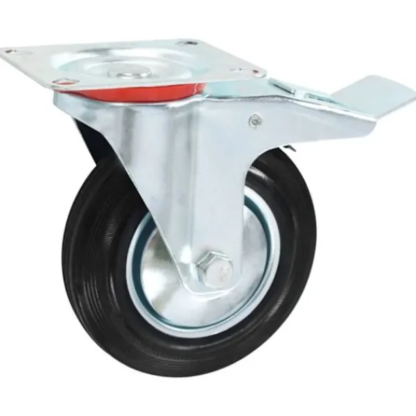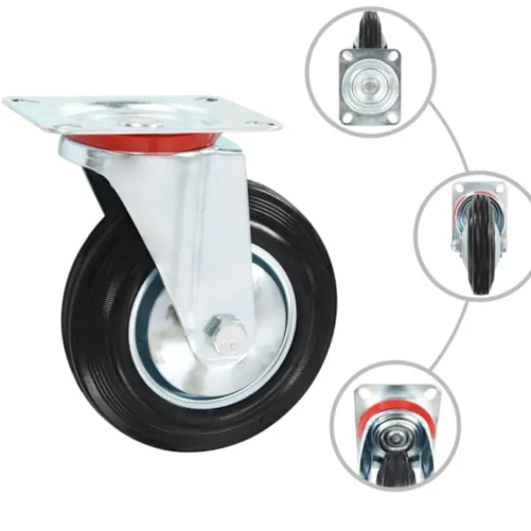 Länkhjulen är tillverkade i gummi som kännetecknas av sitt goda stötdämpande vibrationsmotstånd, som gör dem smidiga och tysta. Dessutom skyddar hjulens mjuka yta ditt golv från repor. Ramen i zinkbelagt järn är högst rostbeständig och bidrar därmed till hjulens stadighet. Hälften av dessa hjul är utrustade med bromsar för flexibel kontroll. Varje länkhjul har en maximal lastkapacitet på 150 kg.