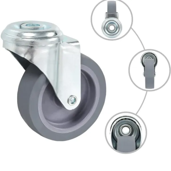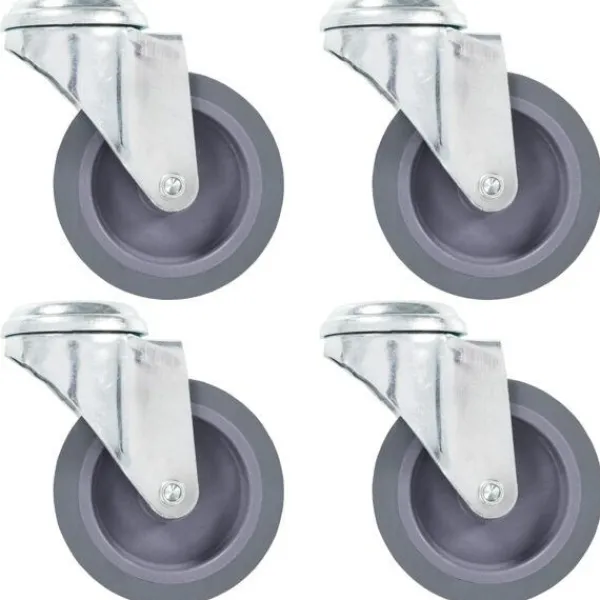 Den här uppsättningen om 4 länkhjul med bulthål blir ett bra tillbehör för mindre utrustning och möbler såsom arbetsbänkar, vagnar, soffbord, växtställ, bokhyllor, kundvagnar med mera. Länkhjulen är tillverkade i TPR (termoplastiskt gummi) som kännetecknas av sitt goda stötdämpande vibrationsmotstånd, som gör dem smidiga och tysta. Dessutom skyddar hjulens mjuka yta ditt golv från repor. Ramen i zinkbelagt järn är högst rostbeständig och bidrar därmed till hjulens stadighet. Varje länkhjul har en maximal lastkapacitet på 45 kg. Vid leverans ingår 4 länkhjul med bulthål.