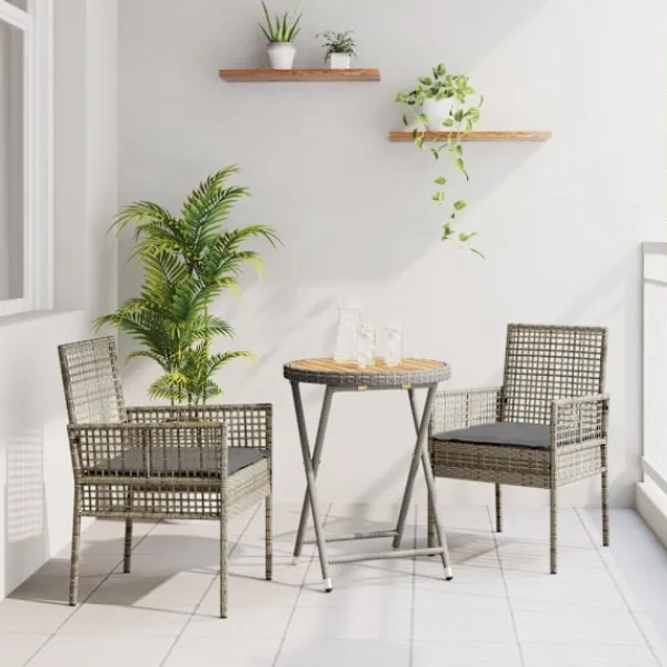 - Ingående komponenter: Varje del är noga utformad för att förbättra din upplevelse utomhus. Bordet är gjort av massivt akaciaträ som är hållbart och har en vacker brun nyans som passar alla trädgårdar. Avtagbara kuddar ger extra komfort och fästs med dragkedjor för enkel rengöring. De platta armstöden i Poly Rattan gör sittandet avslappnat, perfekt för lata morgnar eller samlingar med vänner.