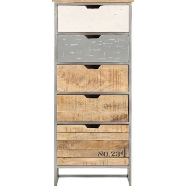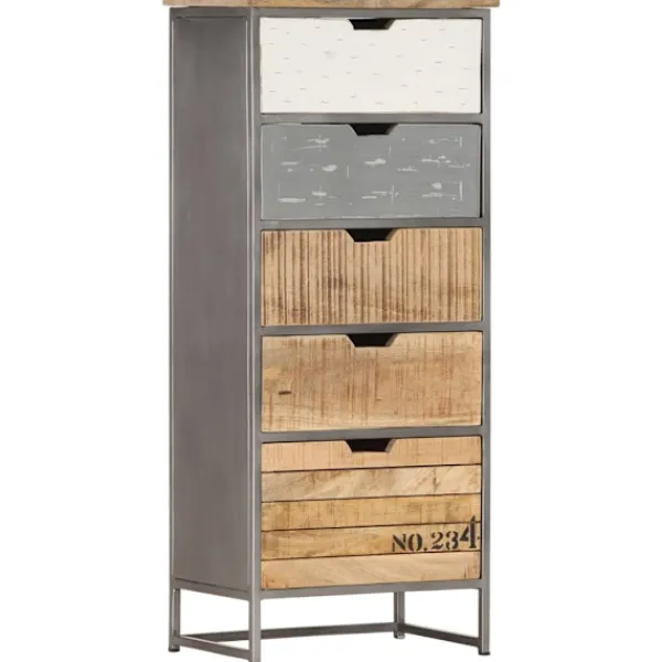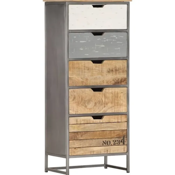 Denna TV-bänk i trä utstrålar en vintage charm och blir mittpunkten i din heminredning. Denna byrå är tillverkad i massivt mangoträ, ett lövträ med rika ådringar. Grovt mangoträ är inte bara starkt nog för att bära upp vikten, det är också tåligt och hållbart. Därför är detta vackert designade sidoskåp stabilt, hållbart och iögonfallande. Hantverket och de vackra träådringarna gör varje möbel unik och något annorlunda än alla andra. Järnhandtagen bidrar till sidobyråns industriella stil. Skänken har dessutom 5 lådor med gott om plats för att förvara dina kläder, böcker och andra prylar. Byrån är enkel att montera. Viktigt: Färger varierar från möbel till möbel, vilket gör varje möbel unik. Leveransen är slumpartad, vilket säkerställer varje produkts exklusivitet och individualitet. Varning: För att förhindra att den välter måste denna produkt användas med den medföljande väggfästenheten.