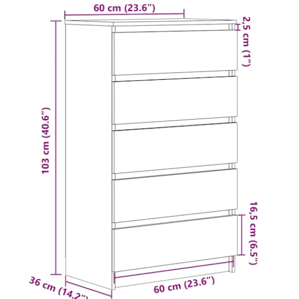Är du på jakt efter ett snyggt lådskåp? Detta väldesignade lådskåp tillför en elegant charm till din befintliga inredning! Stabilt och hållbart: Konstruerat trä är ett mångsidigt material som är populärt för sin släta yta, stabilitet och hållbarhet. Den är motståndskraftig mot skevning och splittring, vilket gör den till ett utmärkt val för ett brett spektrum av applikationer som möbler, konstruktion och hemrenoveringsprojekt.Gott om förvaringsutrymme: Denna lådkista med 5 stora lådor ger gott om förvaringsutrymme för att hålla dina olika dagliga nödvändigheter välorganiserade och inom räckhåll.Robust ovansida: Dess robusta ovansida är perfekt för att placera krukväxter, inramade foton och andra dekorativa föremål.Lätt att rengöra ytan: Byrån är lätt att rengöra med en fuktig trasa. Varning:För att förhindra att den välter måste denna produkt användas med den medföljande väggfästenheten.