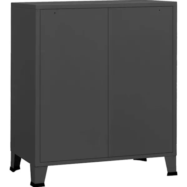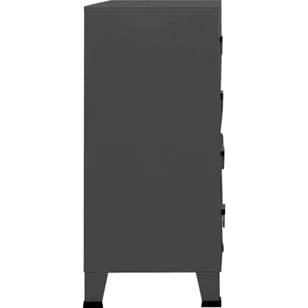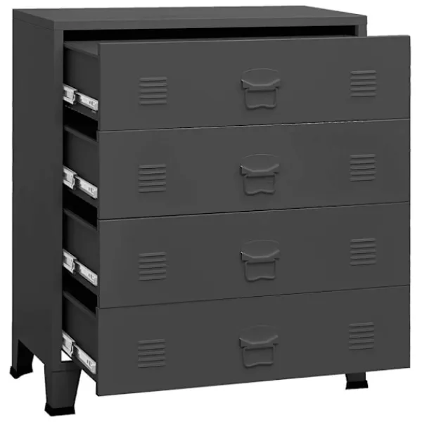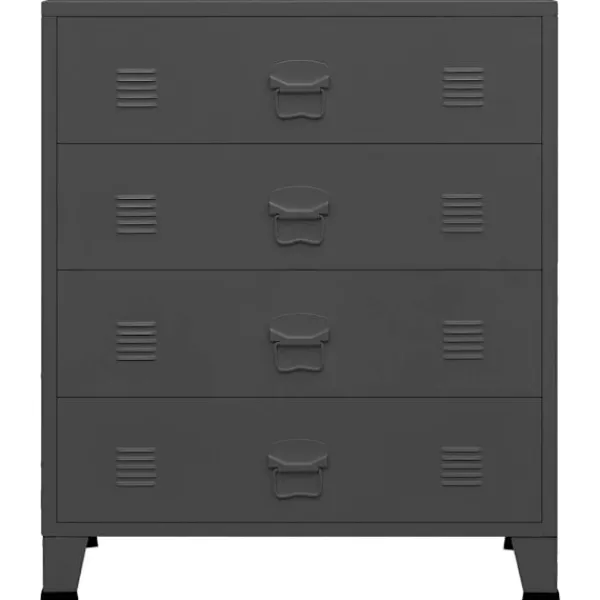 Denna byrå kommer hålla ditt hem rent och organiserat! Det här förvaringsskåpet är tillverkat av metall, vilket gör det robust och stabilt. Skåpet har 4 lådor med gott om förvaringsutrymme för att hålla dina DVD-skivor, multimedieapparater, böcker och små viktiga föremål organiserade och inom räckhåll. Varje låda är utrustad med luftventiler som understryker dess industriella utseende. Det är också lätt att rengöra med en fuktig trasa.