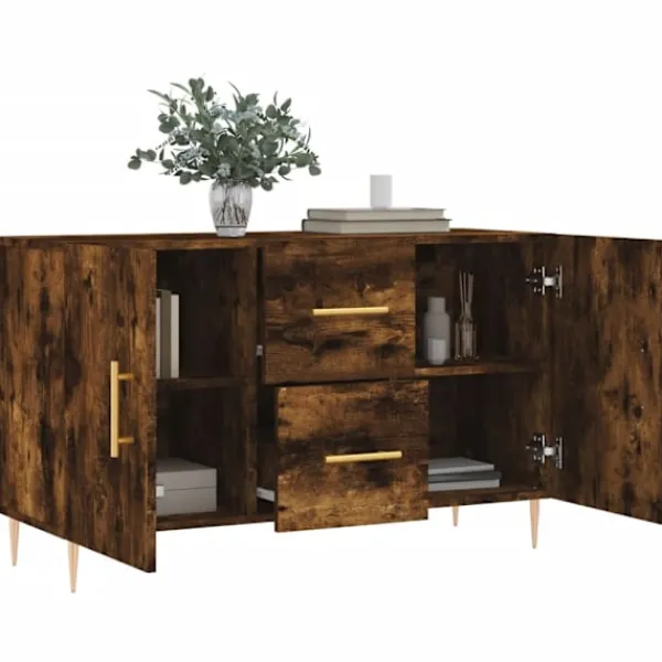 Denna moderna skänk med ett tidlöst utseende kan bli ett perfekt tillägg till din heminredning. Hållbart material: Det konstruerade träet är av exceptionell kvalitet med slät yta och är också starkt, stabilt och fuktbeständigt. Metallben: Metallbenen utstrålar en modern och lugn charm i din inredning samtidigt som du garanteras stabilitet. Gott om förvaring: Skåpet har gott om förvaringsutrymme för att hålla dina olika saker välorganiserade och inom räckhåll.Robust toppskiva: Toppskivan är perfekt för att visa upp dekorationer, foton och krukväxter. Praktiska dörrar: Håll dina saker fria från damm genom att förvara dem bakom dörrarna.Dessutom gör skåpets handtag det enkelt att öppna dörrarna. Varning:För att förhindra att den välter måste denna produkt användas tillsammans med det medföljande väggfästet.