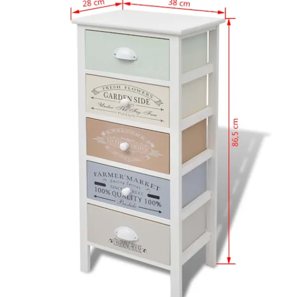 Lägg till en touch av rustik charm i ditt hem med denna shabby chic byrå i en klassisk fransk lantlig stil! Denna byrå är utrustad med 5 mjukt rullande lådor med handtag, vilka erbjuder mängder med utrymme för förvaring av personliga tillhörigheter, och håller därmed ditt hem i bättre organiserad ordning. Lådorna med en vintage-stil bidrar till byråns lantliga charm, dom kan även byta plats. Den är dessutom perfekt för uppvisandet av vackra inramade foton, vaser med blommor eller krukväxter. Byrån är tillverkad i högkvalitativa material, vilket gör den riktigt hållbar och lättsam att rengöra.