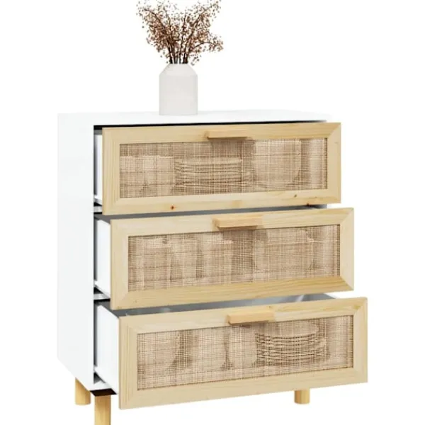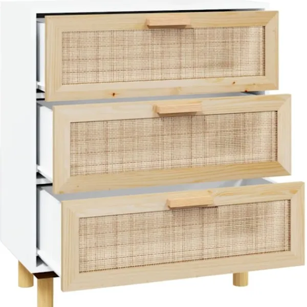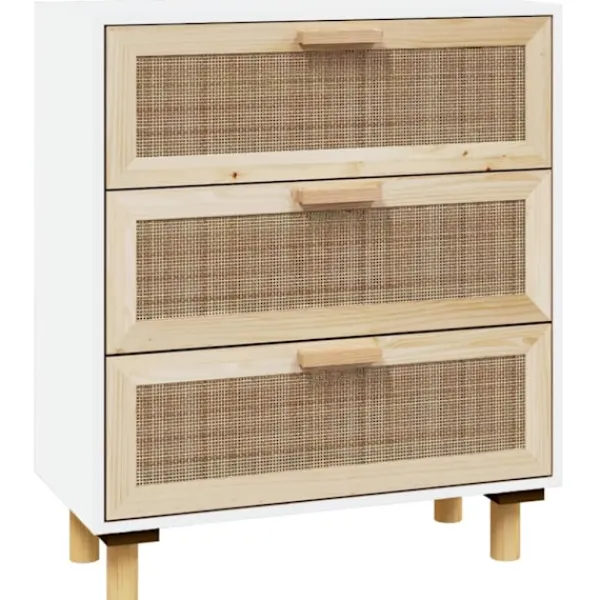 Denna skänk i trä uppfyller dina olika krav och blir ett perfekt tillskott i ditt rum. Hållbart material: Det konstruerade träet är av exceptionell kvalitet med slät yta och är också starkt, stabilt och fuktbeständigt.Gott om förvaringsutrymme: Bordet är utrustat med 3 lådor som erbjuder gott om förvaringsutrymme för att hålla dina olika dagliga saker välorganiserade och inom räckhåll. Dessutom är den fin tack vare dess dörrar i naturlig rotting.Fötter i massiv furu: Träfötterna ger skänken ett naturligt och behagligt utseende samtidigt som stabiliteten säkerställs. Den smälter in med vilken inredning som helst.Robust ovansida: Du kan också placera dina favoritfoton, dekorationer eller blommor ovanpå skåpet för att berika ditt rum. Observera:Varje produkt levereras med en monteringsmanual i lådan för enkel montering. Varning:För att förhindra att den välter måste denna produkt användas med den medföljande monteringsanordningen för vägg