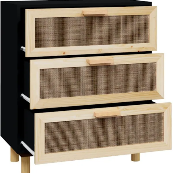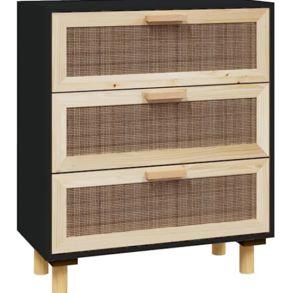 Denna skänk i trä uppfyller dina olika krav och blir ett perfekt tillskott i ditt rum. Hållbart material: Det konstruerade träet är av exceptionell kvalitet med slät yta och är också starkt, stabilt och fuktbeständigt.Gott om förvaringsutrymme: Bordet är utrustat med 3 lådor som erbjuder gott om förvaringsutrymme för att hålla dina olika dagliga saker välorganiserade och inom räckhåll. Dessutom är den fin tack vare dess dörrar i naturlig rotting.Fötter i massiv furu: Träfötterna ger skänken ett naturligt och behagligt utseende samtidigt som stabiliteten säkerställs. Den smälter in med vilken inredning som helst.Robust ovansida: Du kan också placera dina favoritfoton, dekorationer eller blommor ovanpå skåpet för att berika ditt rum. Observera:Varje produkt levereras med en monteringsmanual i lådan för enkel montering. Varning:För att förhindra att den välter måste denna produkt användas med den medföljande monteringsanordningen för vägg