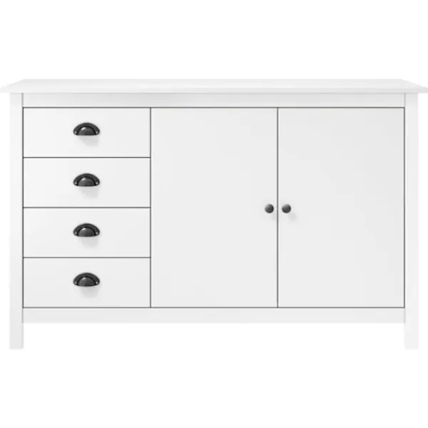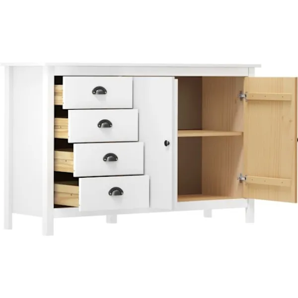 Håll allt organiserat i din inredning med vår eleganta skänk. Skänken är tillverkad i massiv furu som gör den stabil och stadig. Tack vare dess två dörrar och 4 rymliga lådor med skålhandtag erbjuder den gott om förvaringsplats för att hålla dina olika föremål i perfekt ordning och inom räckhåll.