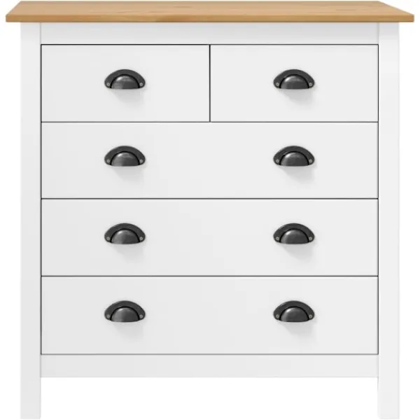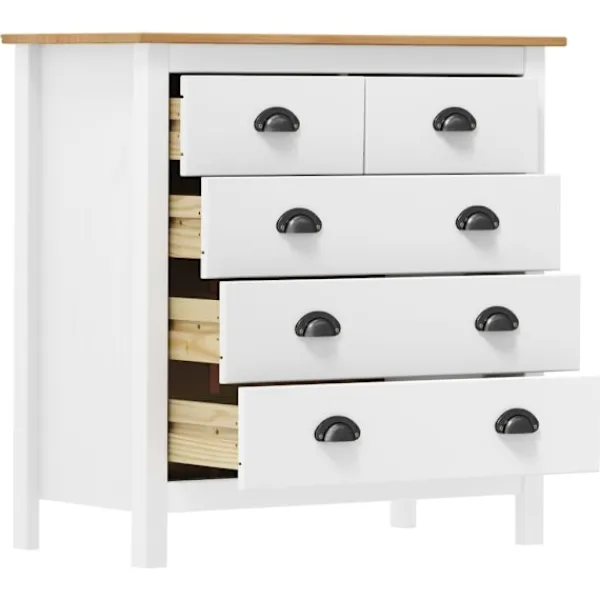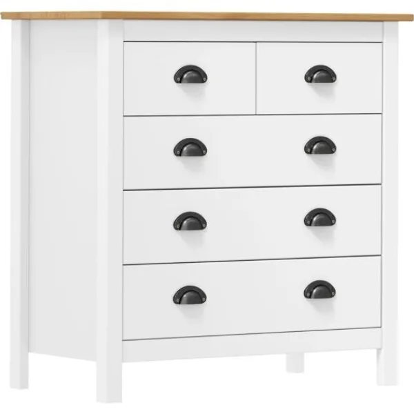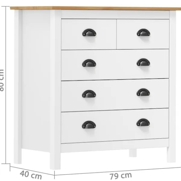Den moderna träskänken är designad för att bli en tidlös detalj i din inredning. Det kompakta skåpet har 5 lådor som är enkla att öppna, vilket ger dig gott om plats att hålla småsaker organiserade och inom räckhåll. Dessutom kan ovansidan användas som en plats att ställa en fruktskål eller visa upp dekorativa föremål såsom fotoramar eller krukväxter. Skänken är också enkel att rengöra med en torr trasa.