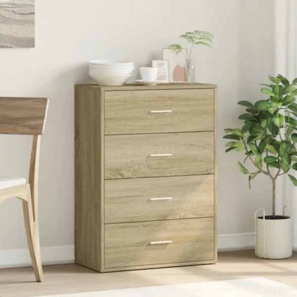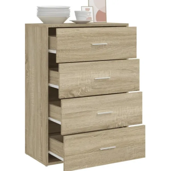 - Hållbart material: Det konstruerade träet är av exceptionell kvalitet med slät yta och är också starkt, stabilt och fuktbeständigt. Skänken är tillverkad av konstruerat trä och är lätt att rengöra med en fuktig trasa.