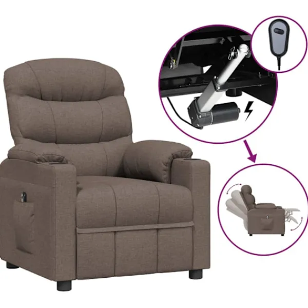 Luta dig tillbaka och koppla av i den här mycket bekväma reclinerfåtölj! Elektrisk justering : Denna vilofåtölj är utrustad med en elektrisk motor för justering av ryggstöd och fotstöd. Den har 3 justerbara lägen, vilket gör att du enkelt kan justera ryggstödet och fotstödet med den medföljande handkontrollen med två knappar enligt din komfort.Bekväm sittupplevelse: Det tjockt vadderade sätet, ryggstödet och de breda armstöden täckta i tyg bidrar till en mysig och varm känsla, vilket gör att du känner dig omfamnad när du sitter. Tyget är slitstarkt, andas och har ett enkelt och rent utseende.Massiv och stabil ram: Ramen av trä och metall bidrar till en stark och stabil konstruktion. Denna fällbara fåtölj är bekväm och hållbar.