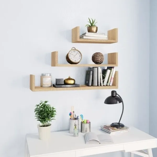 Denna uppsättning med 3 hyllor kombinerar stil och funktionalitet. Det är ett enkelt och elegant alternativ för att sätta prägel på ditt rum. Hyllorna är modernt designade och blir perfekt i ditt kök, vardagsrum eller sovrum när du behöver en plats att placera dina vardagliga prylar. Vägghyllorna är tillverkade av konstruerat trä, vilket säkerställer robusthet, hållbarhet och lång livslängd. Dess U-formade design erbjuder förvaringsutrymme för dina böcker, CD-skivor, blommor och andra väsentligheter. Hyllorna är lätta att montera. Vid leverans ingår 3 hyllor.
