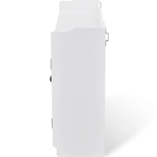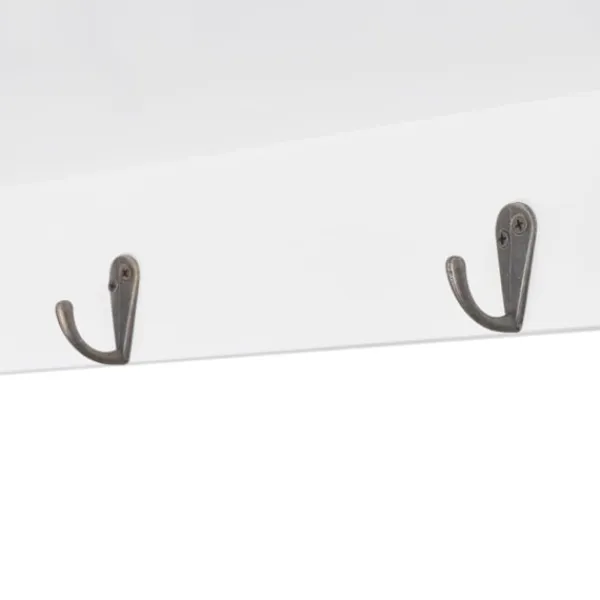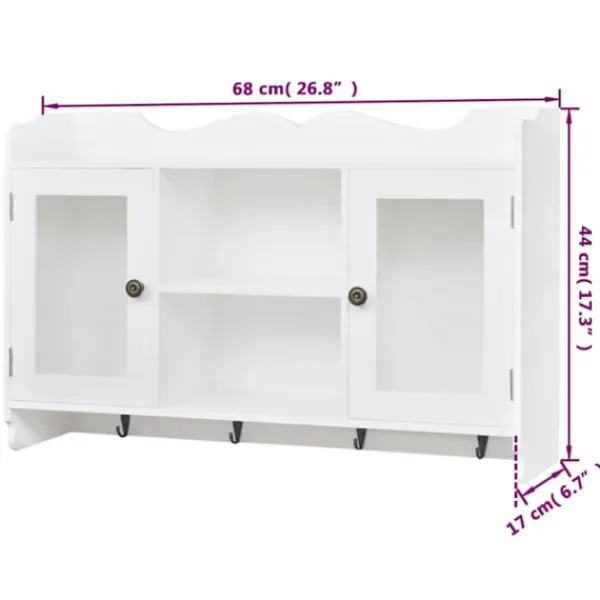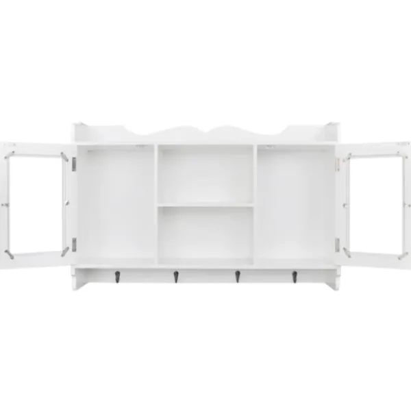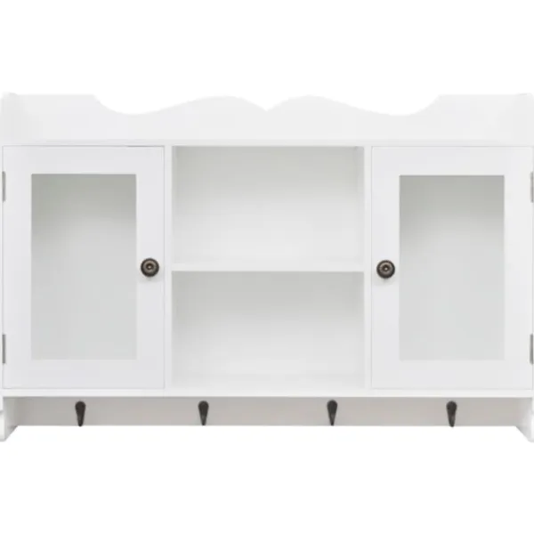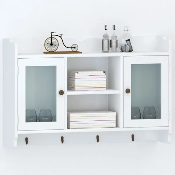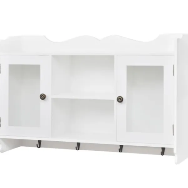 Denna häftiga vägghylla kommer bli pricken över i;et i ditt vardagsrum, sovrum eller din hall. Tack vare det osynliga monteringssystemet, är detta skåp riktigt enkelt att installera. Det fungerar utmärkt för förvaring av exempelvis, troféer, böcker, samlarobjekt, smycken, mm. Produkten är tillverkad i högkvalitativ målad MDF. Dess två glaspanel-dörrar ser till att innehållet håller sig fritt från damm. De fyra krokarna erbjuder dig en plats att hänga nycklar, paraplyn, jackor väskor eller annat som du vill ha nära till hands. Detta väggskåp har en underbart stilren och dekorativ design, vilket passar in i alla typer av hemdekor.