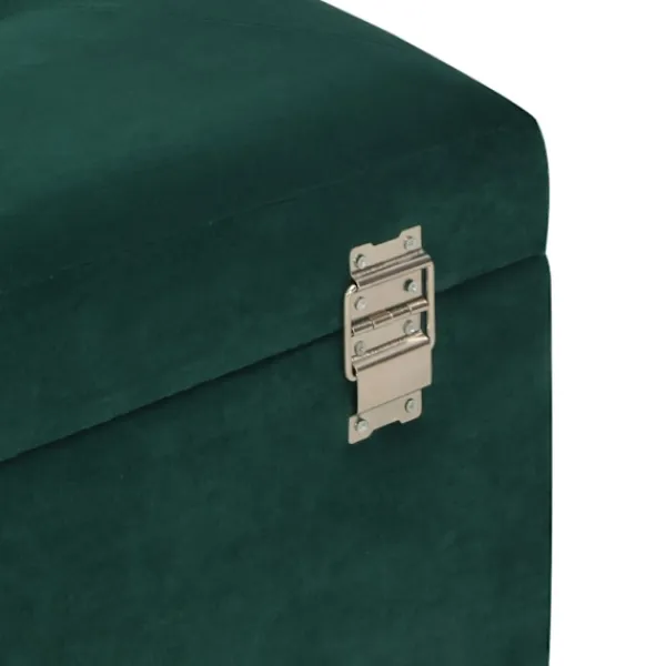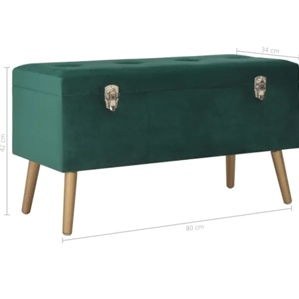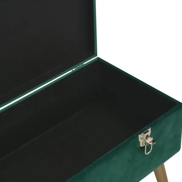Denna bänk i sammet blir garanterat ett blickfång i vardagsrummet, hallen eller salongen. Den gröna sammetsklädseln är mjuk och mycket mysig samtidigt som den ger din inredning en färgglad detalj. Den har ett inbyggt förvaringsutrymme med extra plats för att förvara dina prylar. De guldmålade träbenen bidrar dessutom till hallbänkens stabilitet och hållbarhet. Bänken blir en elegant dekoration i din inredning och en oumbärlig del av rummet.