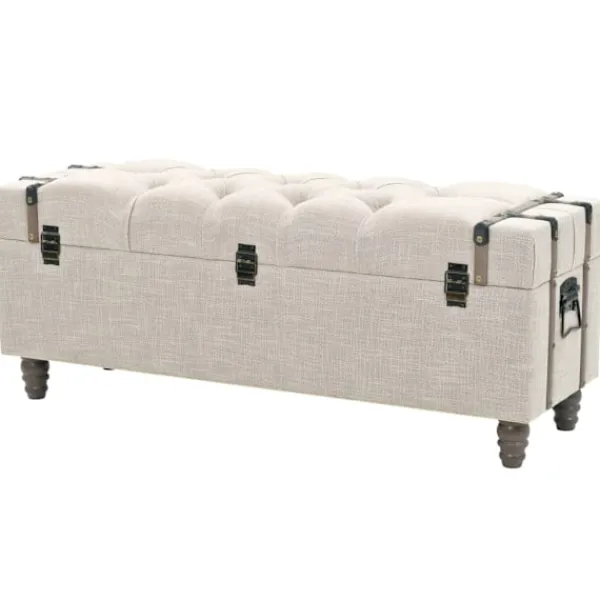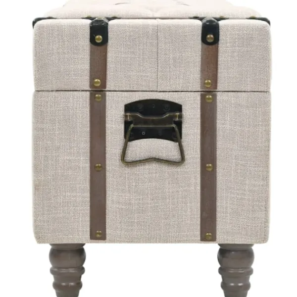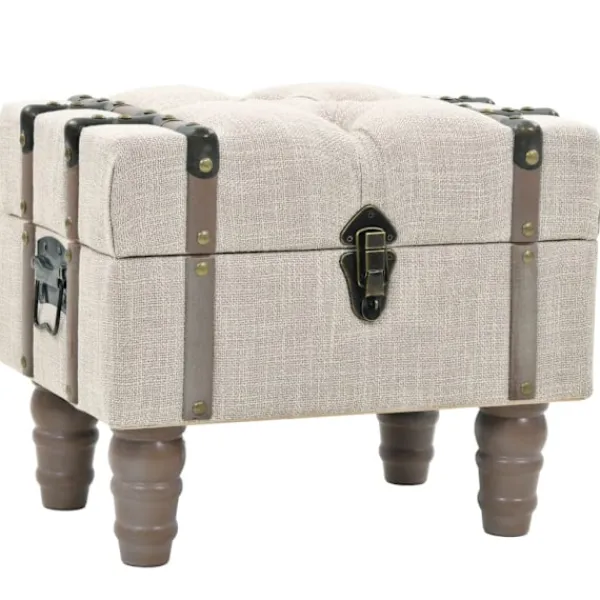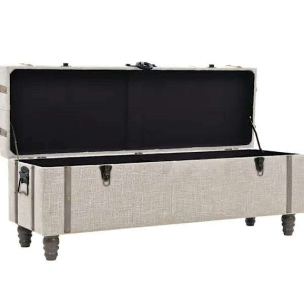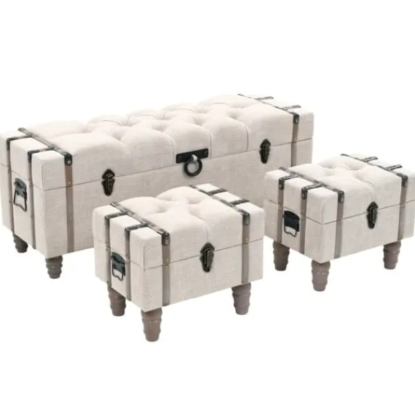 Skapa en känsla av vintage i din inredning med vårt set om 3 förvaringsbänkar. Förvaringslådorna är tillverkade i massivt granträ. De har vadderade sitsar som är klädda i ett modernt tyg och har robusta stålben. Det finns gott om utrymme för att hålla många olika föremål utom synhåll men inom räckhåll. Om det behövs kan de 2 små puffarna förvaras inuti den större lådan. Tack vare sina hållbara handtag kan bänkarna formade som resväskor dessutom enkelt flyttas och placeras i alla rum. Leveransen omfattar 3 förvaringsbänkar. Monteringen av denna produkt är lättsam.