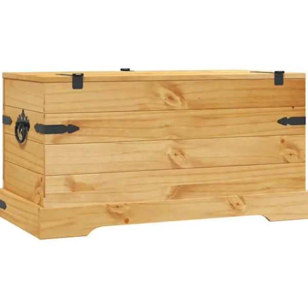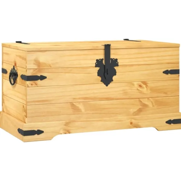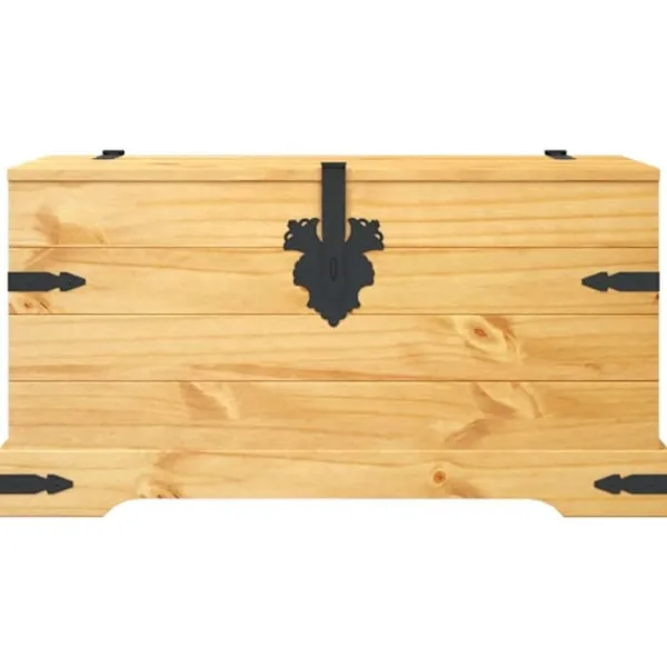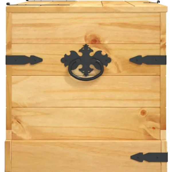 Denna förvaringskista i trä och Coronastil utstrålar en rustik mexikansk charm som kommer att utgöra ett tidlöst inslag i ditt vardagsrum, sovrum eller gästrum, samtidigt som den håller oredan stången. Den rymliga kistan kan användas att förvara filtar, kuddar, leksaker och andra föremål i. Denna rustika förvaringslåda är tillverkad i högkvalitativ furu, vilket gör den väldigt slitstark. Den robusta träkistan kräver minimalt med underhåll, och de vackra träfibrerna ger den en rustik charm. Förvaringslådan har också grovhuggna detaljer i svart metall vilka bidrar till såväl dess hållbarhet som retrostil. Kistan har praktiska handtag och kan låsas. Du kan till och med använda den som ett soffbord eller sidobord.