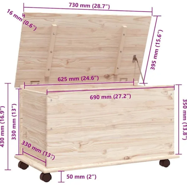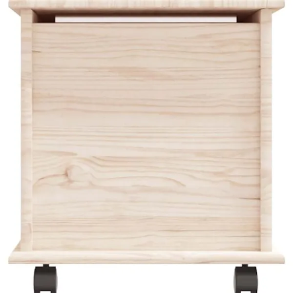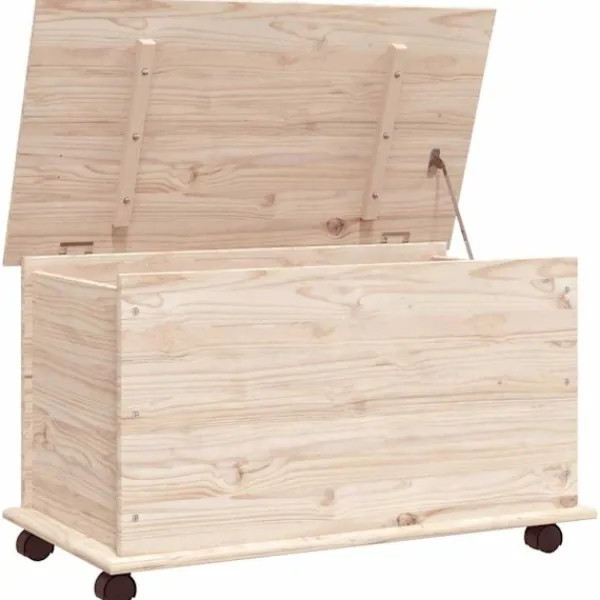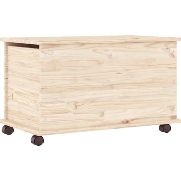 Denna förvaringskista på hjul är en perfekt förvaringslösning till ditt hem. Massiv furu: Massivt furuträ är ett vackert naturmaterial. Furuträ har raka fibrer, och kvistarna ger materialet en rustik utstrålning. Eftersom den är tillverkad i massiv furu är kistan slitstark och robust.Gott om förvaringsutrymme: Denna förvaringskista har en volym på 70 L, med gott om plats för att hålla dina saker välorganiserade.Lätt att öppna och flytta: Du kan enkelt öppna och stänga locket tack vare gångjärnen. Dessutom kan kistan flyttas runt utan ansträngning tack vare de praktiska hjulen.Lätt underhåll: Förvaringskistan är lätt att rengöra med en fuktig trasa och kräver minimalt underhåll.Obehandlad yta: Eftersom förvaringskistan är tillverkad av massiv furu utan ytbehandling kan du behålla dess naturliga färg, men också måla eller lacka den som du vill.