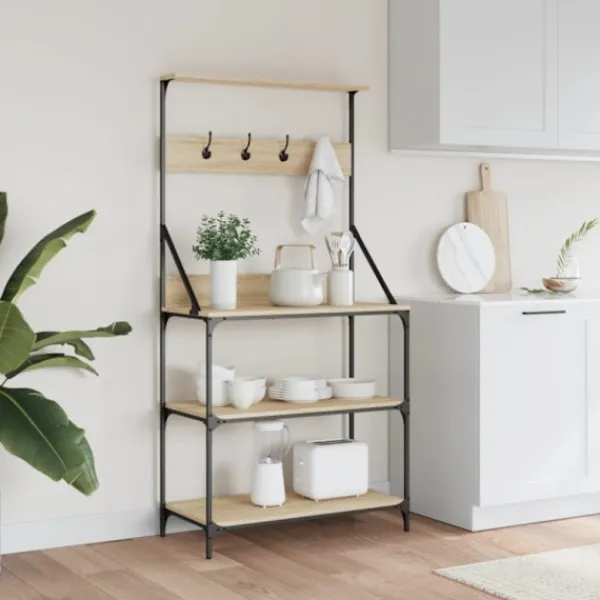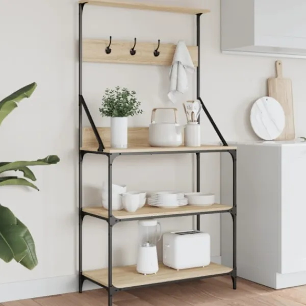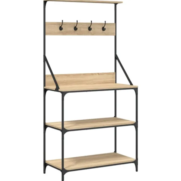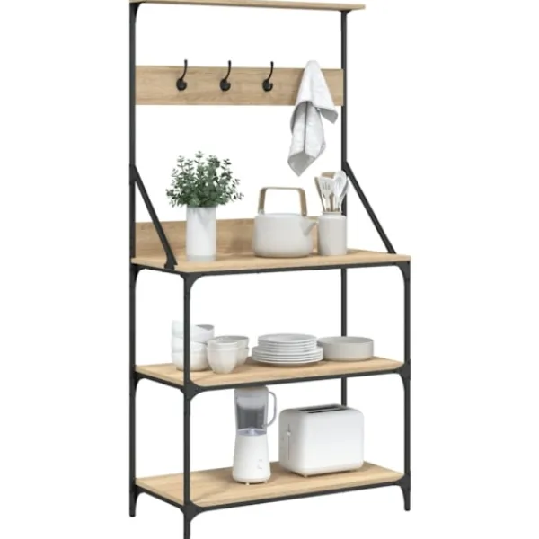 - Robust material: Det konstruerade träet är av exceptionell kvalitet med slät yta och är också starkt, stabilt och fuktbeständigt. Kökshyllans metallram säkerställer robusthet och stabilitet.