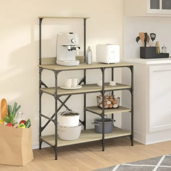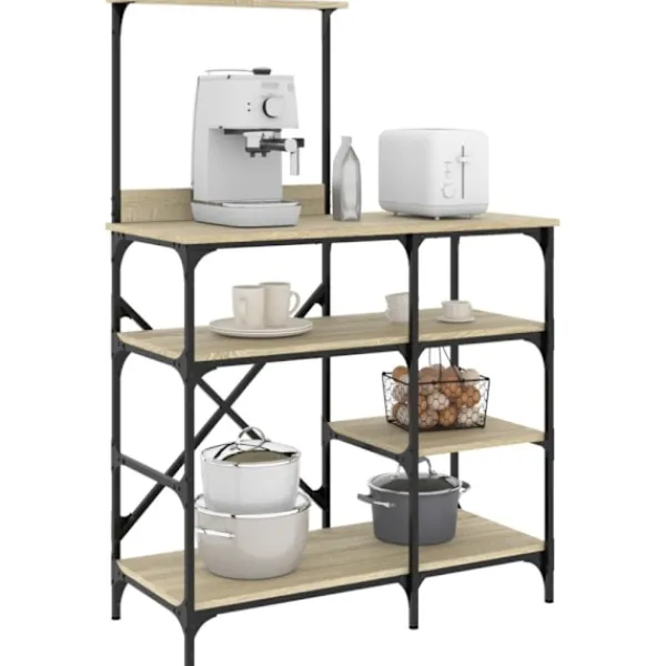 - Robust material: Det konstruerade träet är av exceptionell kvalitet med slät yta och är också starkt, stabilt och fuktbeständigt. Kökshyllans metallram säkerställer robusthet och stabilitet.