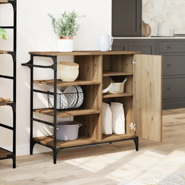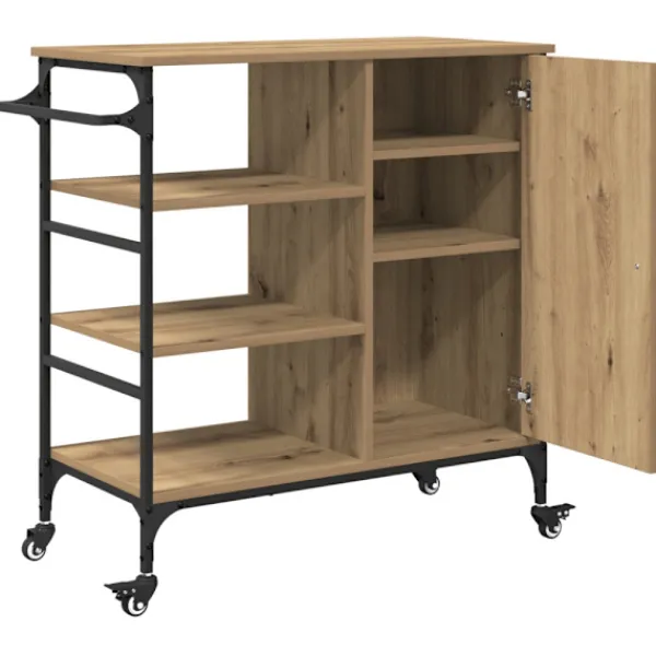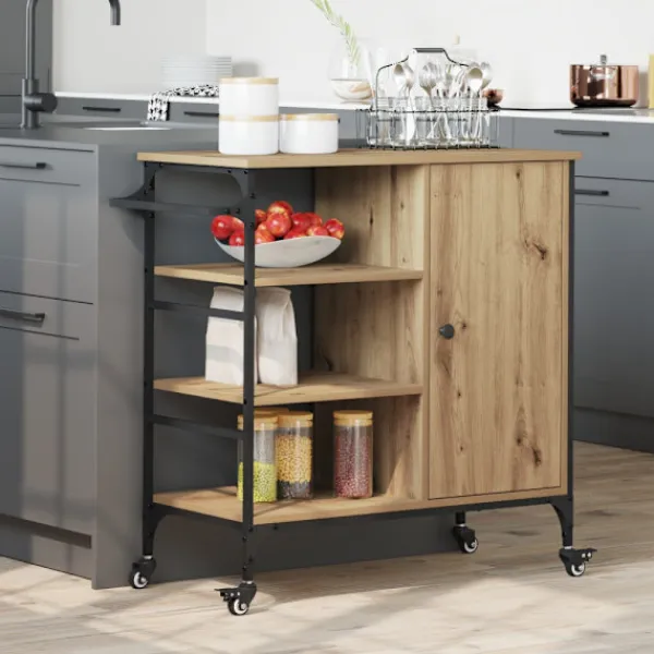 Den här köksvagnen av konstruerat trä är en perfekt kombination av enkelhet och funktionalitet, vilket gör den till en snygg och användbar möbel för varje kök. Den har rena linjer och är smart designad för att utnyttja utrymmet bra, vilket gör den idealisk för dem som vill ha en modern look. Med extra arbetsyta och förvaring passar den bra i olika kök, både för amatörer och proffs. Dess rektangulära form och material gör att den passar bra även i trånga utrymmen, samtidigt som den är mycket användbar.