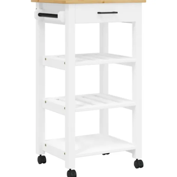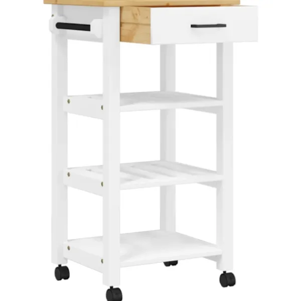 - Hållbart material: Massivt furuträ är ett vackert naturmaterial. Furuträ har raka fibrer, och kvistarna ger materialet en rustik utstrålning. Då den är tillverkad i massiv furu är köksvagnen slitstark och robust.