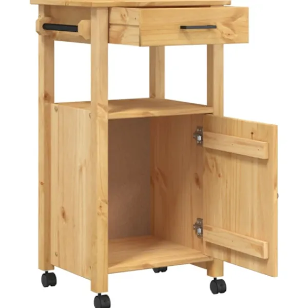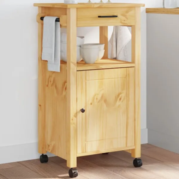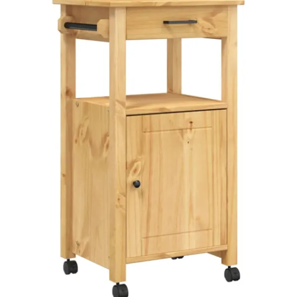- Hållbart material: Massivt furuträ är ett vackert naturmaterial. Furuträ har raka fibrer, och kvistarna ger materialet en rustik utstrålning. Då den är tillverkad i massiv furu är köksvagnen slitstark och robust.