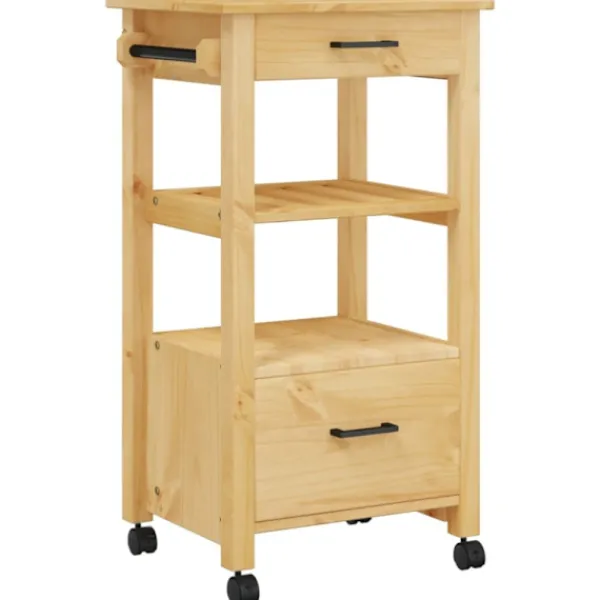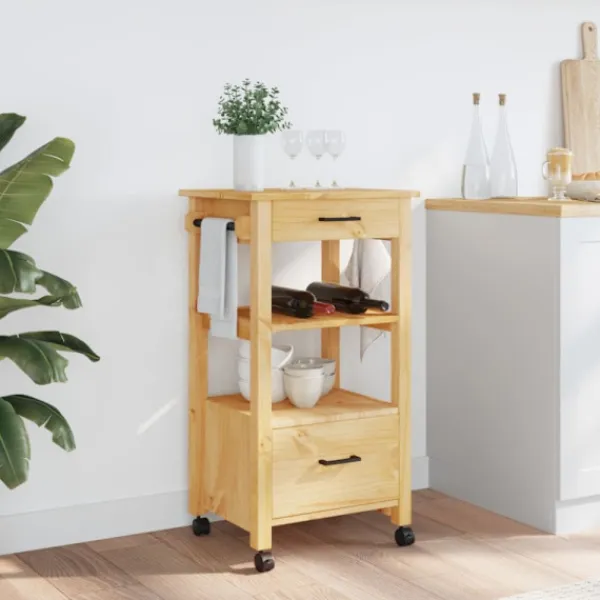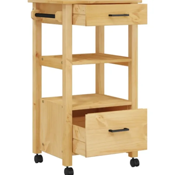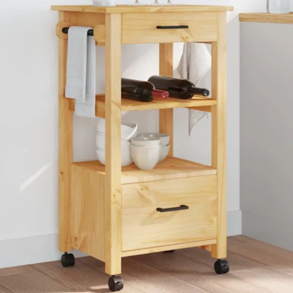 - Hållbart material: Massivt furuträ är ett vackert naturmaterial. Furuträ har raka fibrer, och kvistarna ger materialet en rustik utstrålning. Då den är tillverkad i massiv furu är köksvagnen slitstark och robust.