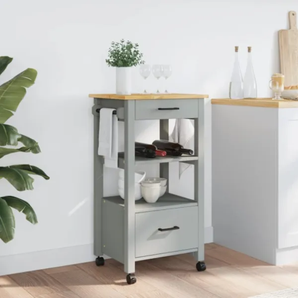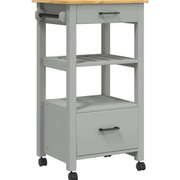 - Hållbart material: Massivt furuträ är ett vackert naturmaterial. Furuträ har raka fibrer, och kvistarna ger materialet en rustik utstrålning. Då den är tillverkad i massiv furu är köksvagnen slitstark och robust.