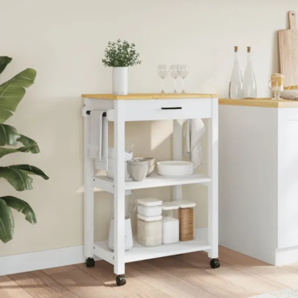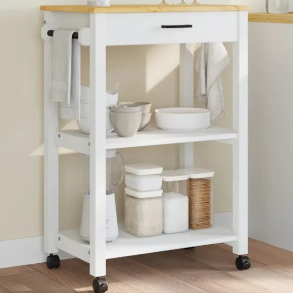 - Hållbart material: Massivt furuträ är ett vackert naturmaterial. Furuträ har raka fibrer, och kvistarna ger materialet en rustik utstrålning. Då den är tillverkad i massiv furu är köksvagnen slitstark och robust.