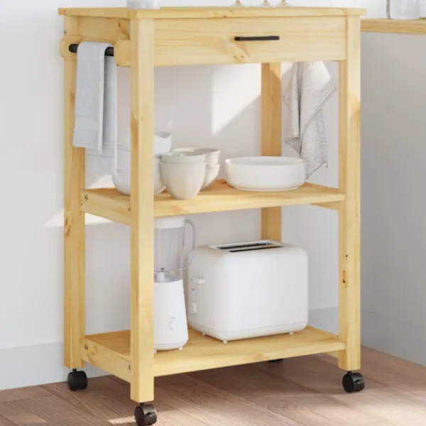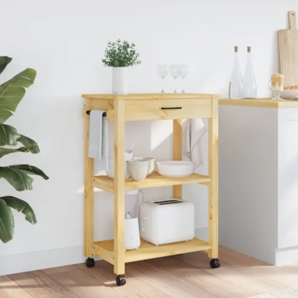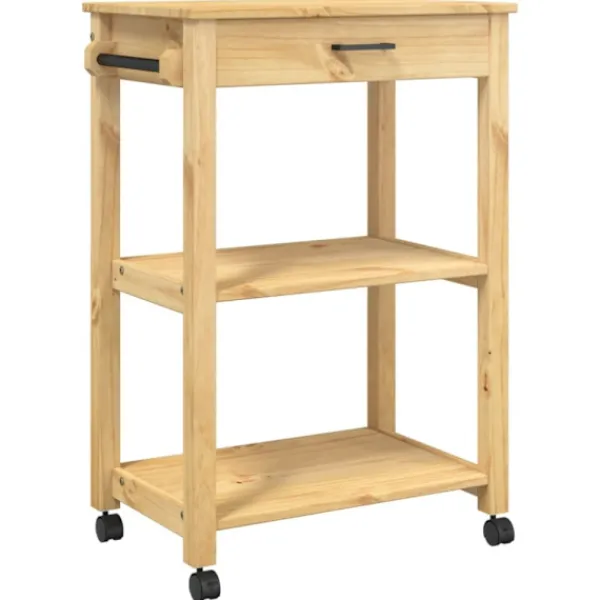 - Hållbart material: Massivt furuträ är ett vackert naturmaterial. Furuträ har raka fibrer, och kvistarna ger materialet en rustik utstrålning. Då den är tillverkad i massiv furu är köksvagnen slitstark och robust.