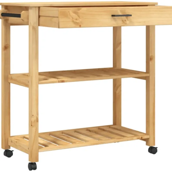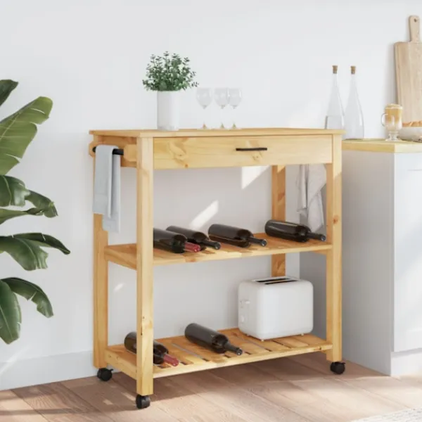 - Hållbart material: Massivt furuträ är ett vackert naturmaterial. Furuträ har raka fibrer, och kvistarna ger materialet en rustik utstrålning. Då den är tillverkad i massiv furu är köksvagnen slitstark och robust.