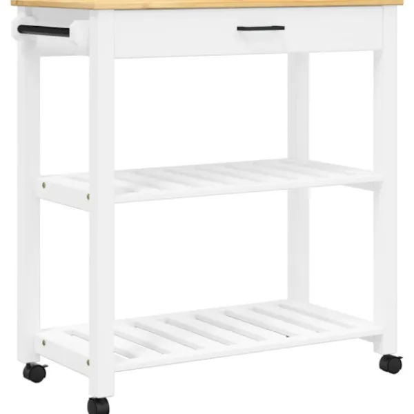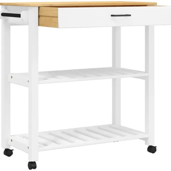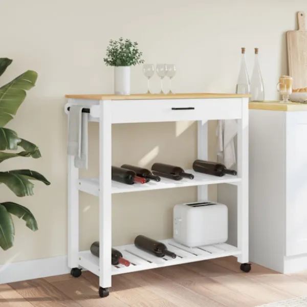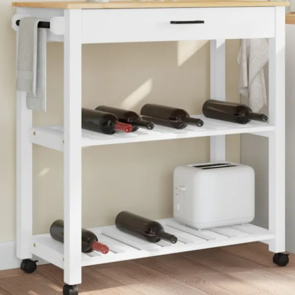 - Hållbart material: Massivt furuträ är ett vackert naturmaterial. Furuträ har raka fibrer, och kvistarna ger materialet en rustik utstrålning. Då den är tillverkad i massiv furu är köksvagnen slitstark och robust.
