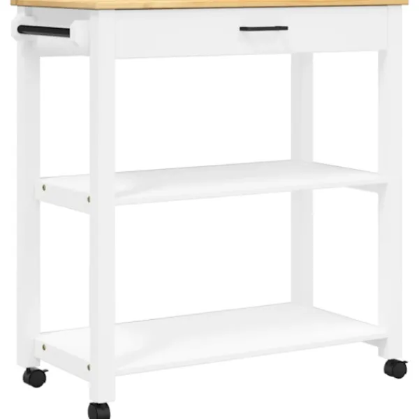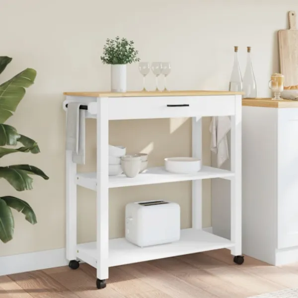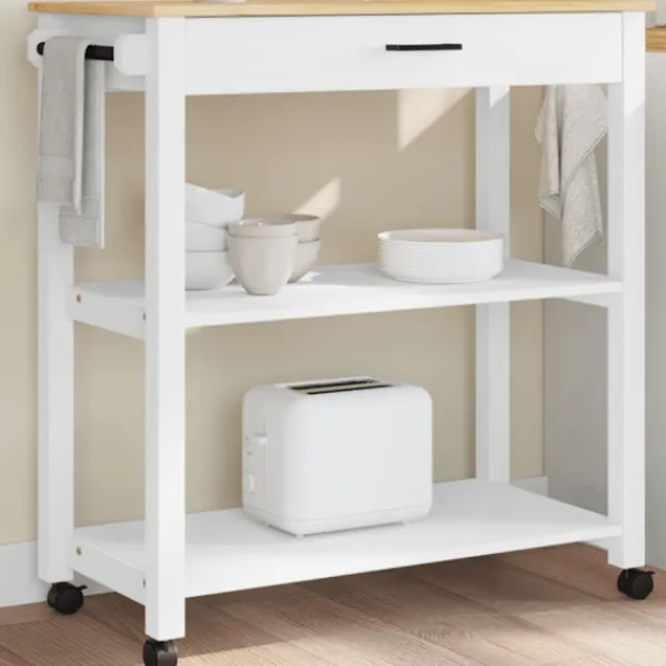 - Hållbart material: Massivt furuträ är ett vackert naturmaterial. Furuträ har raka fibrer, och kvistarna ger materialet en rustik utstrålning. Då den är tillverkad i massiv furu är köksvagnen slitstark och robust.