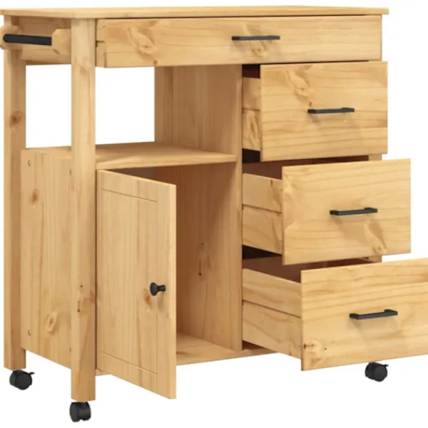 - Hållbart material: Massivt furuträ är ett vackert naturmaterial. Furuträ har raka fibrer, och kvistarna ger materialet en rustik utstrålning. Då den är tillverkad i massiv furu är köksvagnen slitstark och robust.