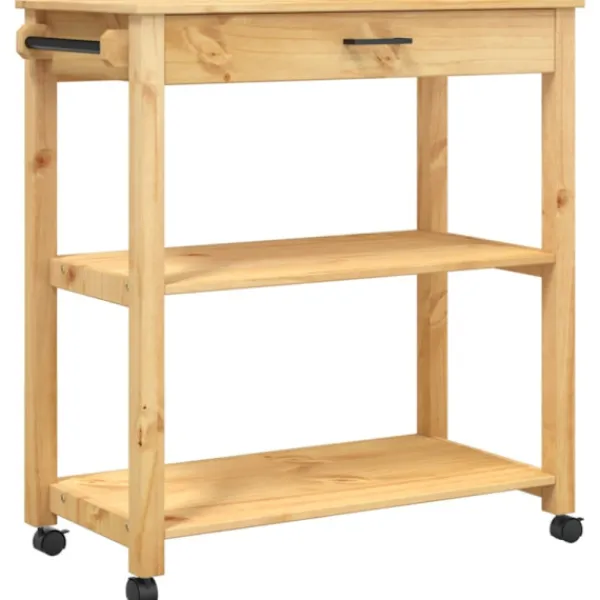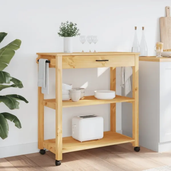 - Hållbart material: Massivt furuträ är ett vackert naturmaterial. Furuträ har raka fibrer, och kvistarna ger materialet en rustik utstrålning. Då den är tillverkad i massiv furu är köksvagnen slitstark och robust.