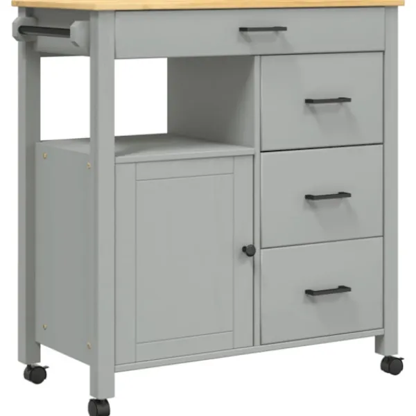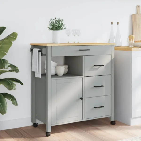 - Hållbart material: Massivt furuträ är ett vackert naturmaterial. Furuträ har raka fibrer, och kvistarna ger materialet en rustik utstrålning. Då den är tillverkad i massiv furu är köksvagnen slitstark och robust.
