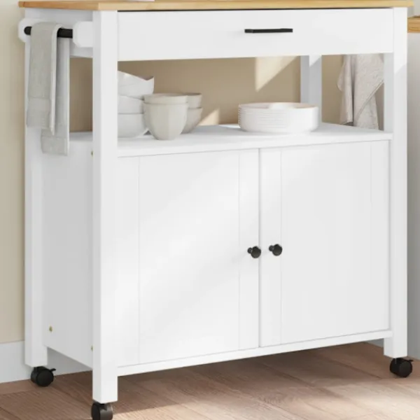 - Hållbart material: Massivt furuträ är ett vackert naturmaterial. Furuträ har raka fibrer, och kvistarna ger materialet en rustik utstrålning. Då den är tillverkad i massiv furu är köksvagnen slitstark och robust.
