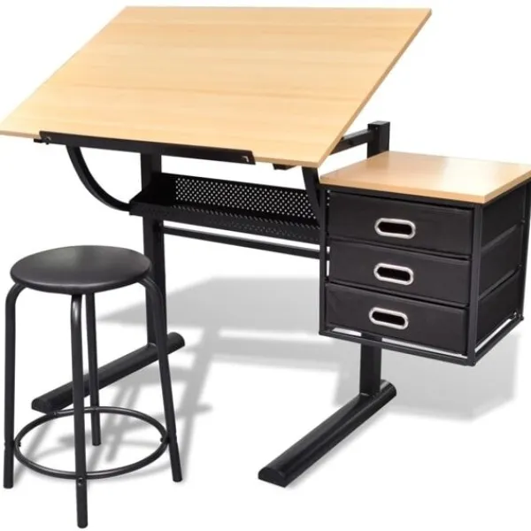 Det här arkitektbordet har gott om bekväm arbetsyta och kommer att bli ett fantastiskt hjälpmedel för ditt tecknande, skrivande osv. Det här högkvalitativa bord med lutningsbar bordsskiva ger gott om arbetsyta, vilket gör att det passar perfekt för studering och tekniskt ritande. Papperstopparen håller kvar papper på bordet medan bänken lutar. Vårt skrivbord har även tre utdragbara lådor för extra förvaring. Pallen som ingår är tjockt vadderad för att du ska kunna ha det bekvämt när du jobbar. Bordet är tillverkat av högkvalitativ MDF och hålls upp av pulverlackerade järnben för hållbarhetens skull, vilket innebär att du kommer att kunna använda det i många år.