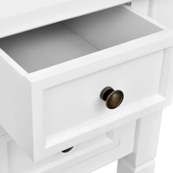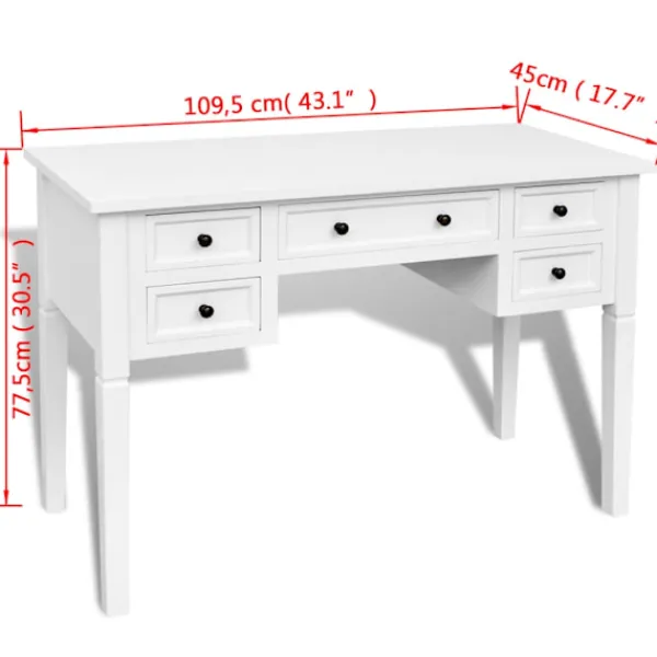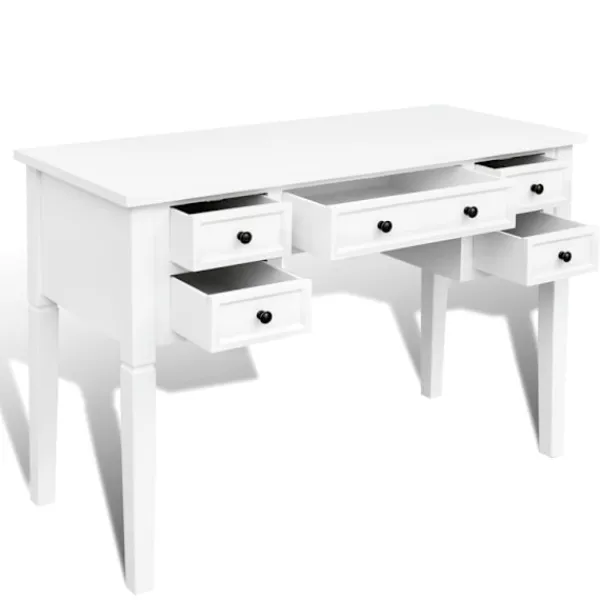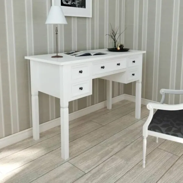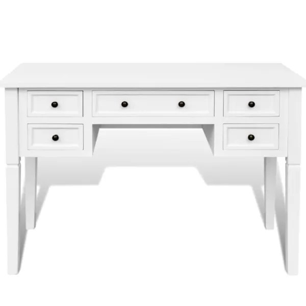 Detta skrivbord med sin enkla men tidlösa design, kommer att bli ett perfekt tillskott till ditt sovrum eller hemmakontor. Detta robusta skrivbord kommer med fem stora och praktiska lådor, vilket har tillräckligt med utrymme för att enkelt organisera dina papper, läxor, dokument eller andra kontorsmaterial. Dess skrivbordsyta ger dig tillräckligt med plats för att husa dina dekorativa ornament eller de kontorsmaterial du vill ha nära till hands. Detta stabila skrivbord är tillverkat av högkvalitativ vitmålad MDF och furu.