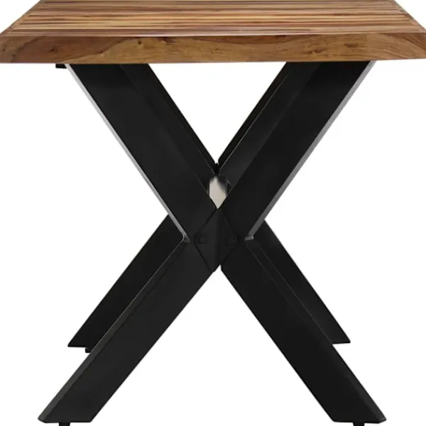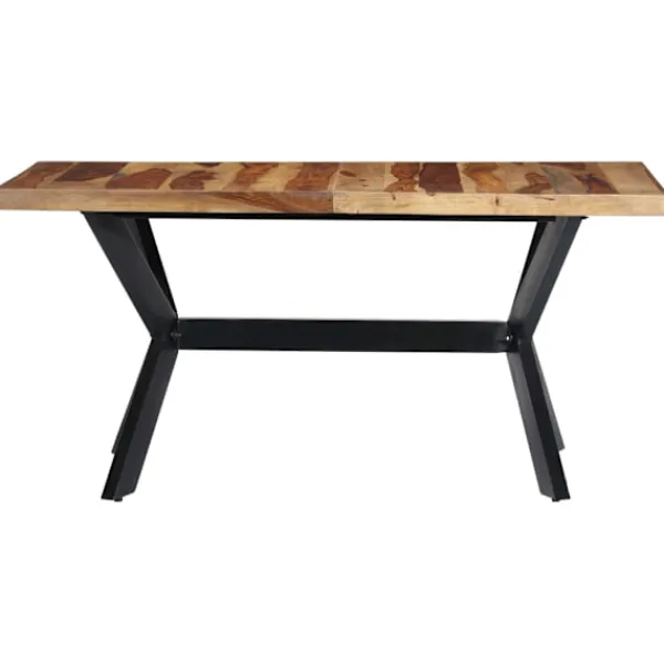 Detta matbord i trä är både vintage och elegant. Det har en vintage charm och industriell stil med sitt massiva sheshamträ och sin kryssformade stålstomme. Det blir ett tidlöst tillskott i din inredning. Matbordet är tillverkat av massivt sheshamträ. Shesham, även kallat rosenträ eller palisander, är ett tropiskt lövträ som är känt för sina rika ådringar. Det skickliga hantverket och de vackra träådringarna gör varje bord unikt och något olikt alla andra. Matbordet är helt handgjort och varje steg i processen utförs med största omsorg, vare sig det är polering, målning eller lackering. Stålbenen tillsammans med den kryssformade stålstommen bidrar till bordets robusta konstruktion och industriella charm. Produkten är lätt att montera. Viktigt: Färger och fibrer varierar från möbel till möbel, vilket gör varje bord unikt. Leveransen är slumpartad, vilket säkerställer varje produkts exklusivitet och individualitet.